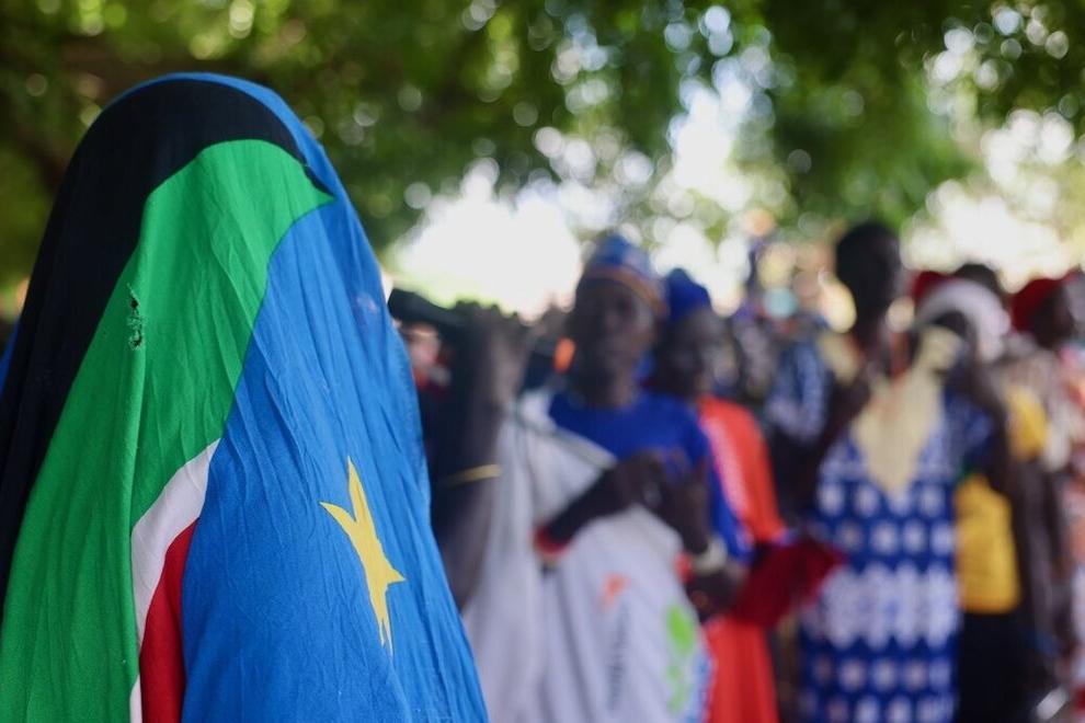 A person in the foreground is facing away from the camera and has covered their head with the South Sudanese flag. In the background, there are more people in bright clothing which have been blurred. All of the these people are standing under trees.