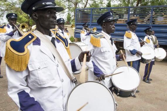Band playing at US embassy donation of equipment to South Sudan National Police Service and its Diplomatic Protection Unit (DPU) in Juba on 13 August. UN Police supported training of the first batch of 100 DPU officers, who…