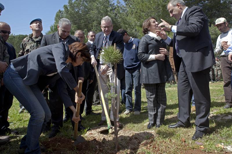 Vice president of Jouzour Loubnan, district commissioner of Marjayoun, the French ambassador, Spanish ambassador, and the mayor of Ebel es Saqi planting trees during a reforestation campaign in Ebel es Saqi (from left to right)