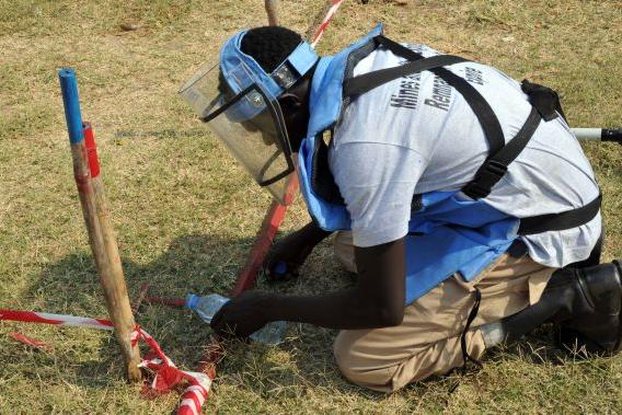 Deminer demonstrating his work during Mine Action Open Day at Juba's Nyakuron Cultural Centre, where UN Mine Action Service and partner organizations highlighted activities in making South Sudan safe from landmines and…